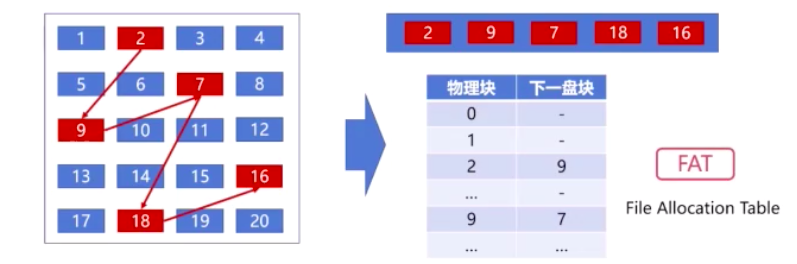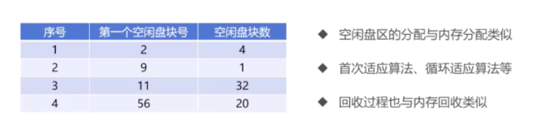 - 空闲链表法把所有空闲盘区组成一个空闲链表
