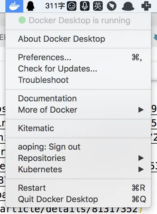 我这里是mac, 安装成功之后,在状态栏有docker图标