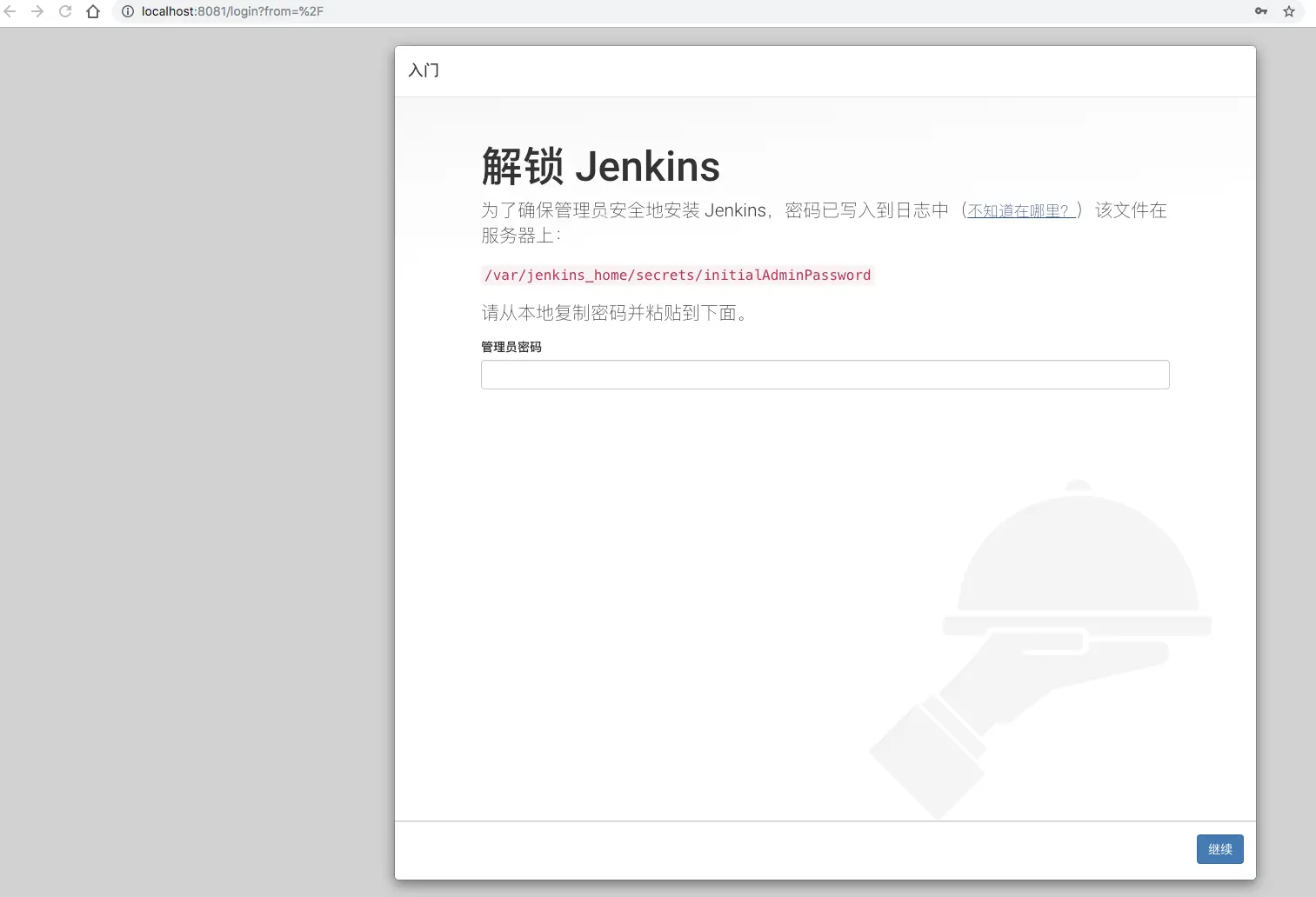 注意: 这里不要直接复制上面的命令,需要把/Users/isaacho/Documents/application/docker/jenkins_home替换成你新建的目录。同样下面如果出现/Users/isaacho/Documents/application/docker/jenkins_home都需要换成你的目录