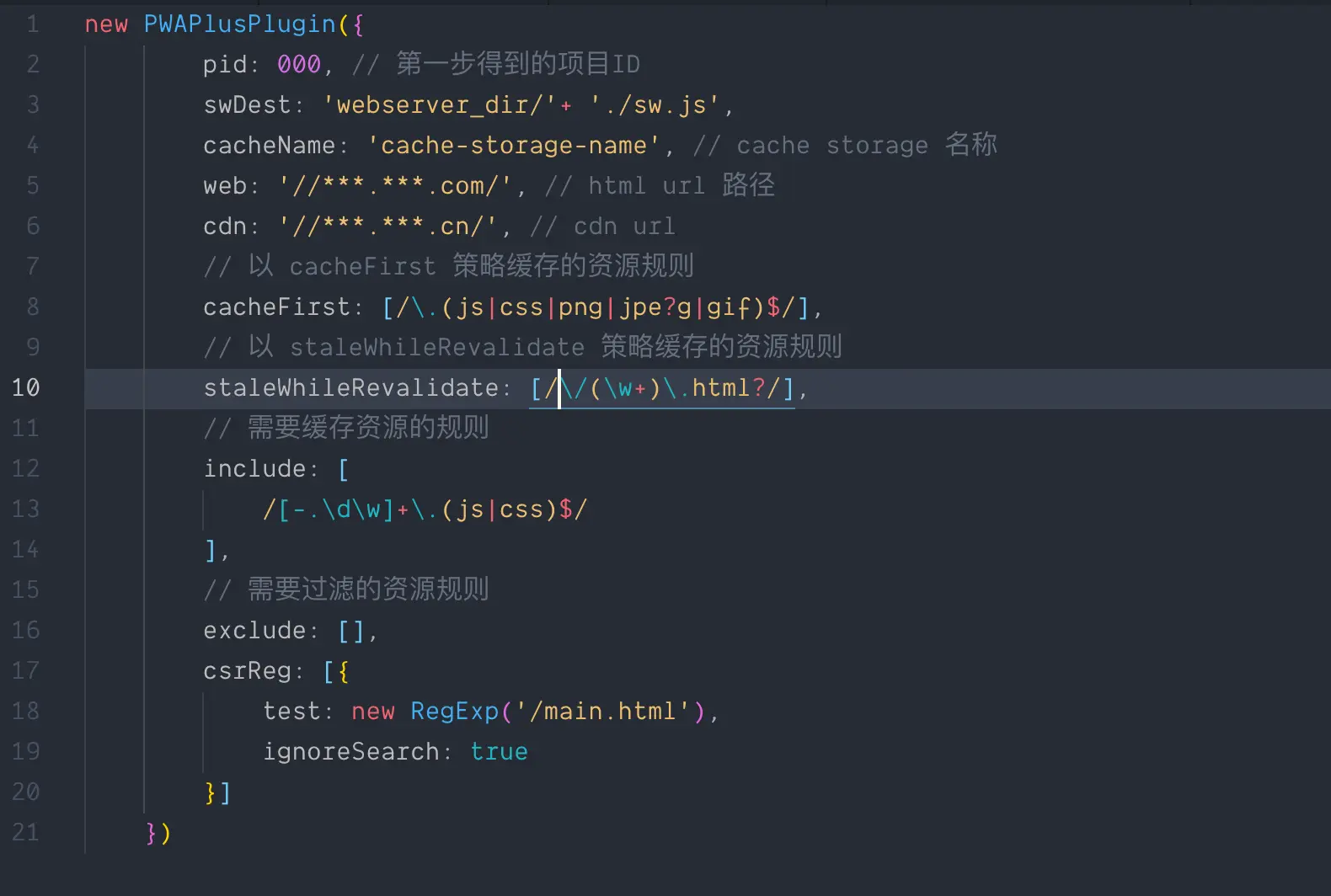 pwa-plus-plugin是PWA-PLUS提供的用于为项目构建出sw.js的webpack插件,其中配置有很多参数,要根据实际项目情况调整