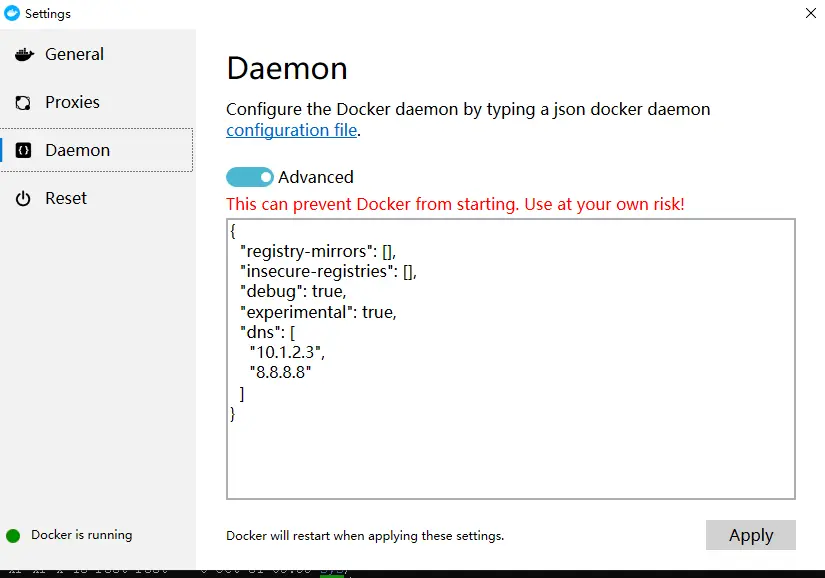 对于使用 Windows 10 的系统,在系统右下角托盘 Docker 图标内右键菜单选择 Settings,打开配置窗口后左侧导航菜单选择 Daemon