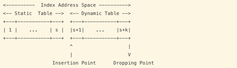 因为索引表的大小的是有限的,它仅保存了一些常用的 http Header,同时每次请求还可以在表的末尾动态追加新的 http Header 缓存,动态部分称之为 Dynamic Table。Static Table 和 Dynamic Table 在一起组合成了索引表: