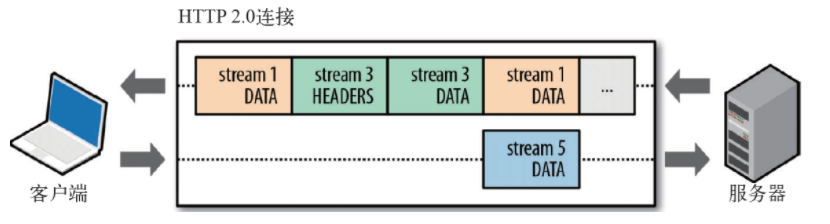 上图展示了一个连接上的多个传输数据流:客户端向服务端传输数据帧stream5,同时服务端向客户端乱序发送stream1和stream3。这次连接上有三个响应请求乱序并行交换。