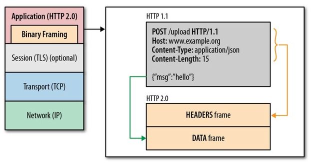 在二进制分帧层上,http2.0会将所有传输信息分割为更小的消息和帧,并对它们采用二进制格式的编码将其封装,新增的二进制分帧层同时也能够保证http的各种动词,方法,首部都不受影响,兼容上一代http标准。其中,http1.X中的首部信息header封装到Headers帧中,而request body将被封装到Data帧中。