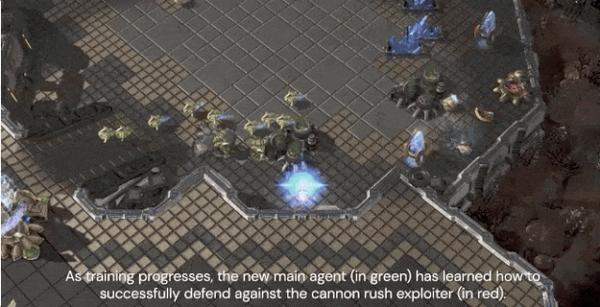 比如,蓝色是主要玩家,负责赢,红色是帮它成长的陪练。小红发现了一种cannon rush技能,小蓝没能抵挡住: