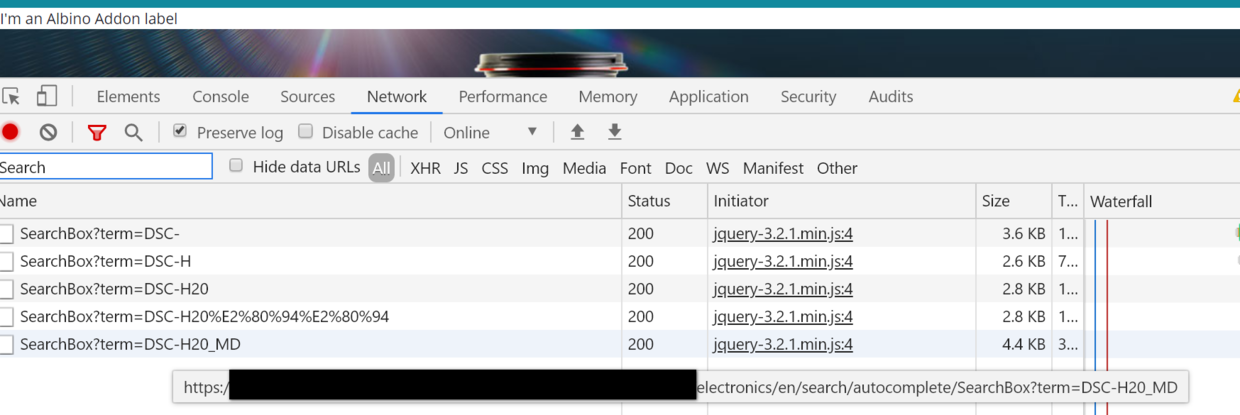 在Hybris Commerce Cloud的storefront的搜索栏键入一些字母,每次键入,会触发一个发送到后台的http请求实现live search的功能: