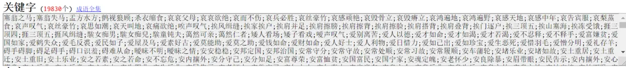 点击之后,存储于该web应用本地存储的一个文本文件里的全部19830个成语,以树的形式加载到内存中,并显示在网页上: