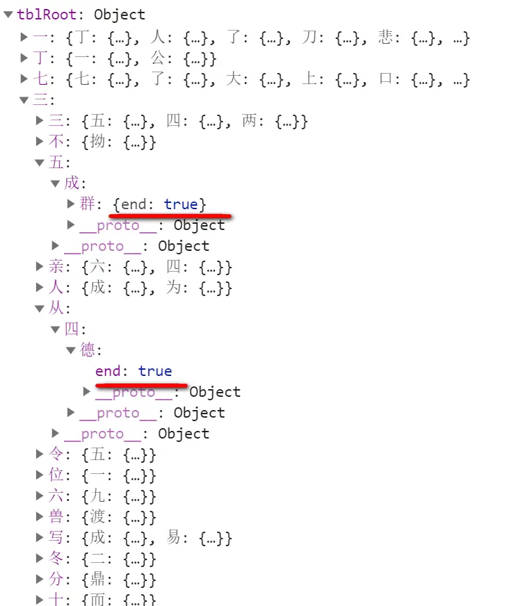 其中叶节点以属性end为true区分。
