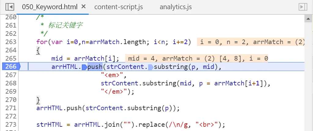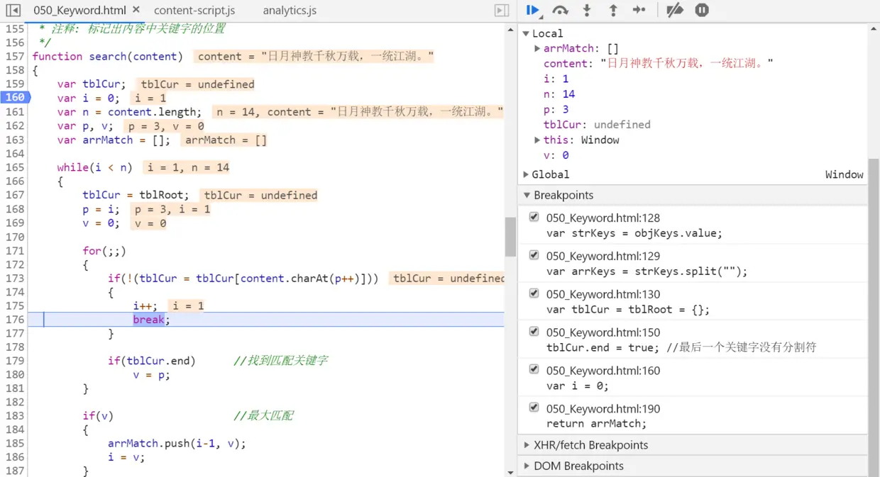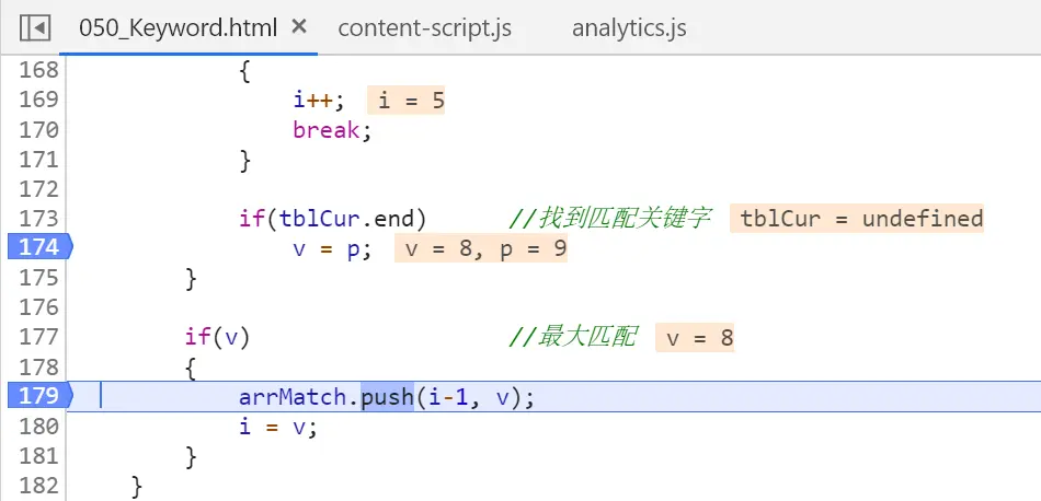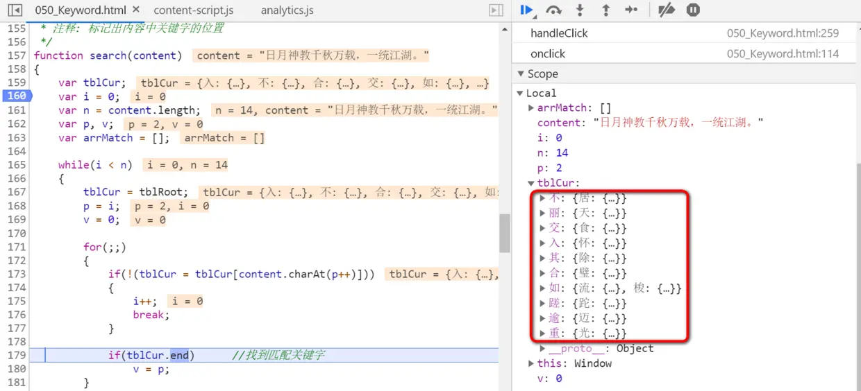 进入165行的外层while循环,再进入173行的内层for循环,检测是否有测试字符串第一个字符“日”开头的成语。因为成语是由4个字符组成,所以需要用内层for循环逐一试探,如果遇到tblCur.end为true的元素,说明在测试字符串中发现了一个成语。