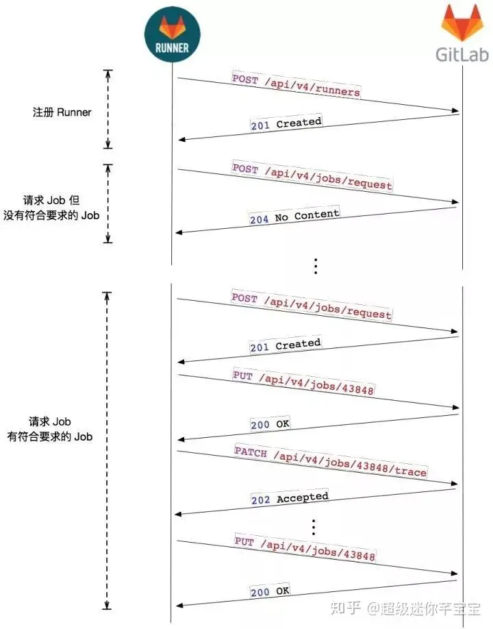 注册成功后,Runner 就会不停的向 GitLab 请求 Job,时间间隔是 3s。若没有请求到 Job,GitLab 返回 204 No Content。如果请求到 Job,GitLab 会把 Job 信息返回回来,Runner 在接收到 Job 之后,会向 GitLab 发送一个确认请求,同时更新任务的状态。之后,Runner 开始 Job 的执行, 并且会定时地将中间数据,以 Patch 请求的方式发送给 GitLab。