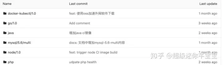 每个文件夹都有 Dockerfile 来描述镜像的基本情况,其中包含了 Java、PHP、Node 和 Go 等不同语言的运行时基础镜像和 CI 镜像,还有 docker-kubectl 这类工具镜像的 Dockerfile。