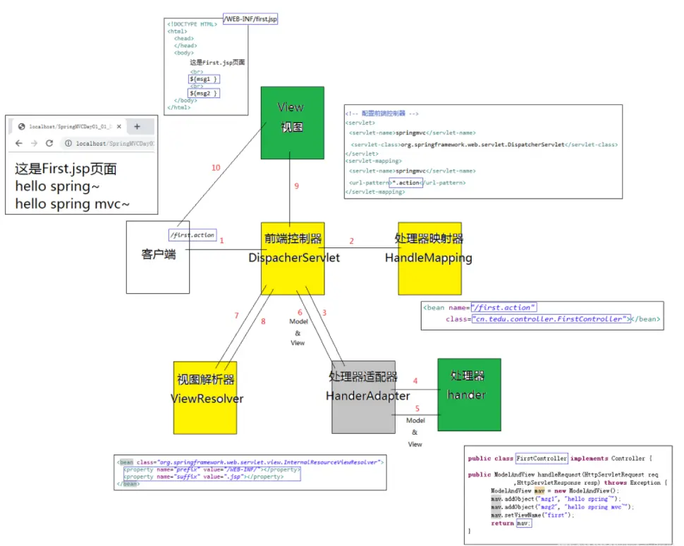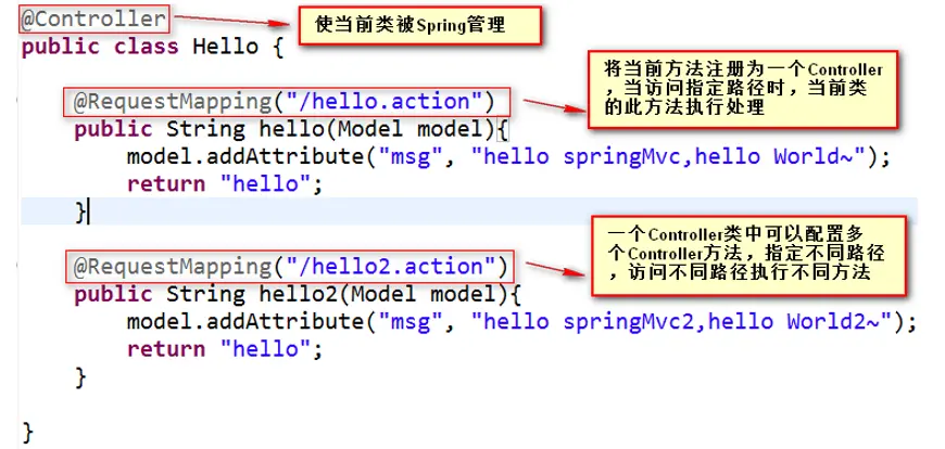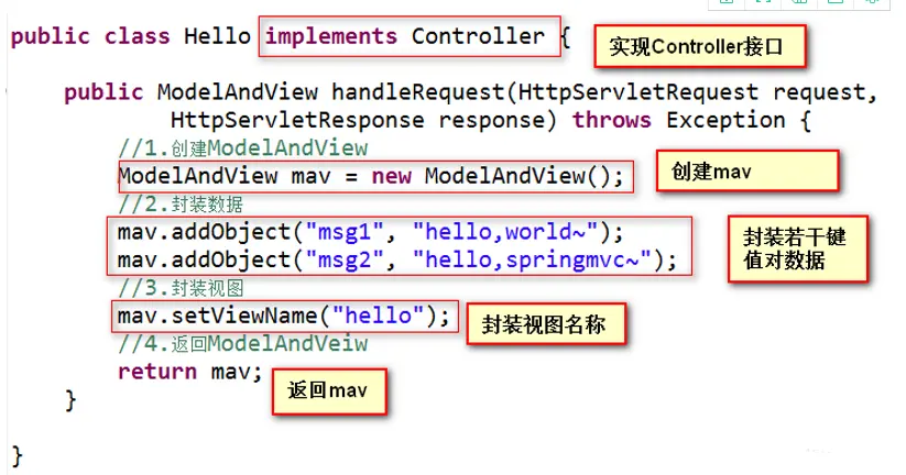 想要开发一个处理器,写一个类实现Controller接口,在其中的handlerRequest中编写代码处理请求,并将处理好的数据和目标视图封装到ModelAndView中返回