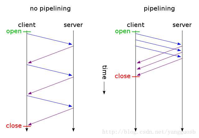 在keep-alive基础上,又提出了pipeline(管线化连接)。在响应到达之前,可以将多条请求放入队列。当第一条请求通过网络流向服务器时,第二条和第三条请求也可以开始发送了。在髙时延网络条件下,这样做可以降低网络的环回时间,提高性能。