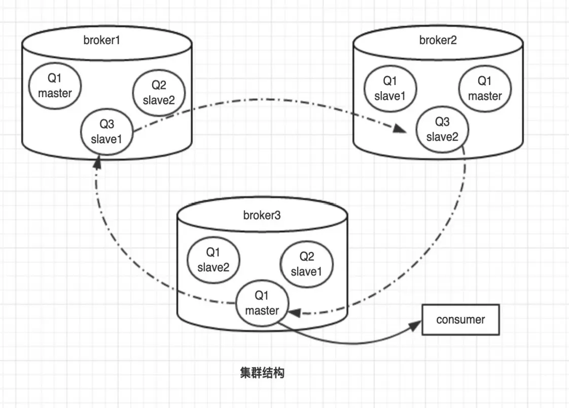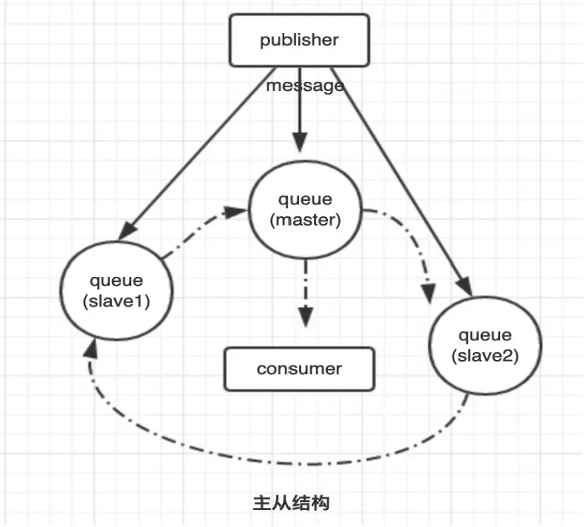 镜像队列包含一个主节点和N个从节点,发送消息时,是会向所有的master以及slave节点发送,除此之外,所有的命令都是发送到master,然后再广播给其他的slave节点;如果客户端连接的是slave节点,会转发到master,然后再将结果发送到slave,然后再到客户端;当master节点宕机后,加入集群时间最久的slave升级为master,因为该slave存在与master最多的信息。