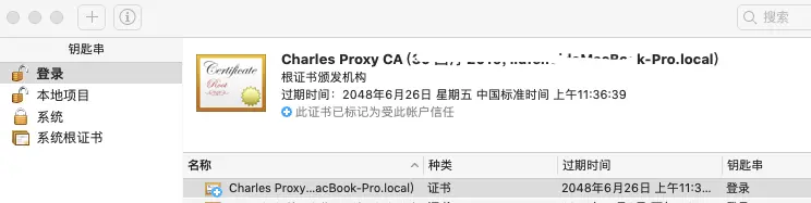Help-> SSL Proxying -> Install Charles Root Certificate 按提示安装证书 安装好后如下: