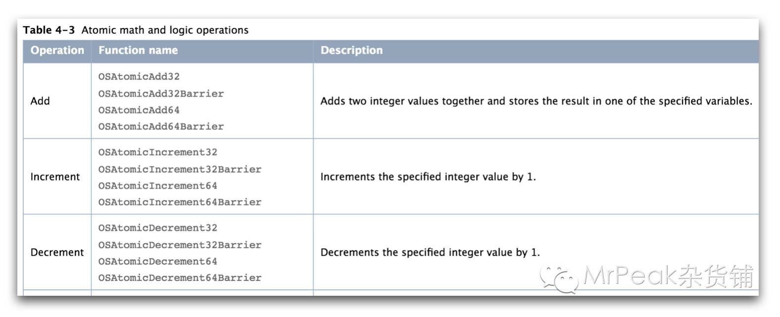 其实除了各种锁之外,iOS上还有另一种办法来获取原子性,使用Atomic Operations,相比锁的损耗要小一个数量级左右,在一些追求高性能的第三方Framework代码里可以看到这些Atomic Operations的使用。这些atomic operation可以在/usr/include/libkern/OSAtomic.h中查到: