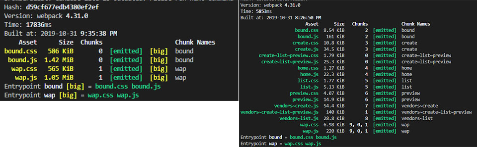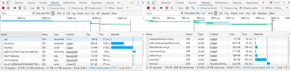 右边是优化后的构建结果,js文件加起来总和才486k,首页的资源只有185k,那么理论加载速度只需要2s