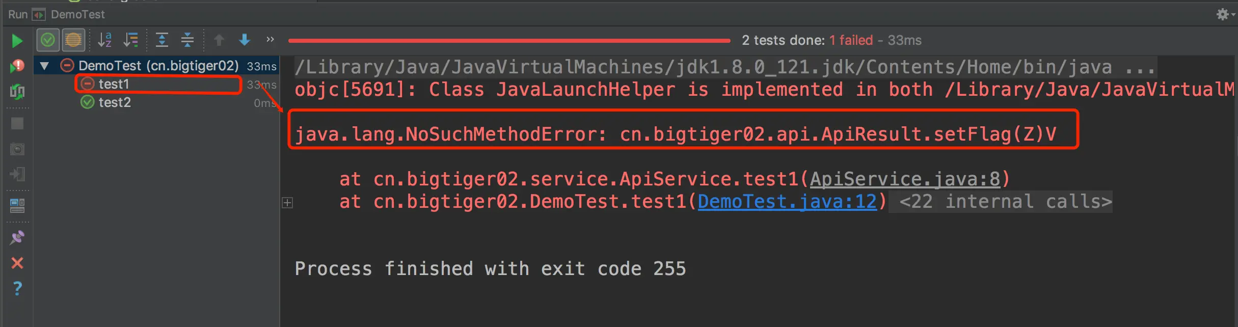 但是异常不会骗人,java.lang.NoSuchMethodError明确表明:ApiResult.setFlag(Boolean)该方法不存在。