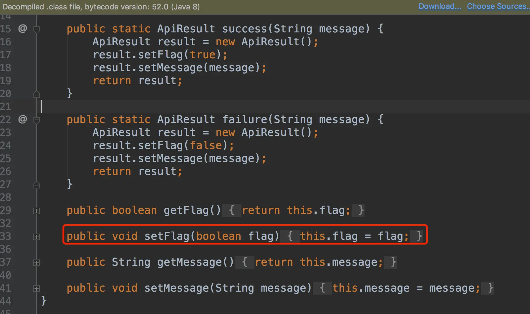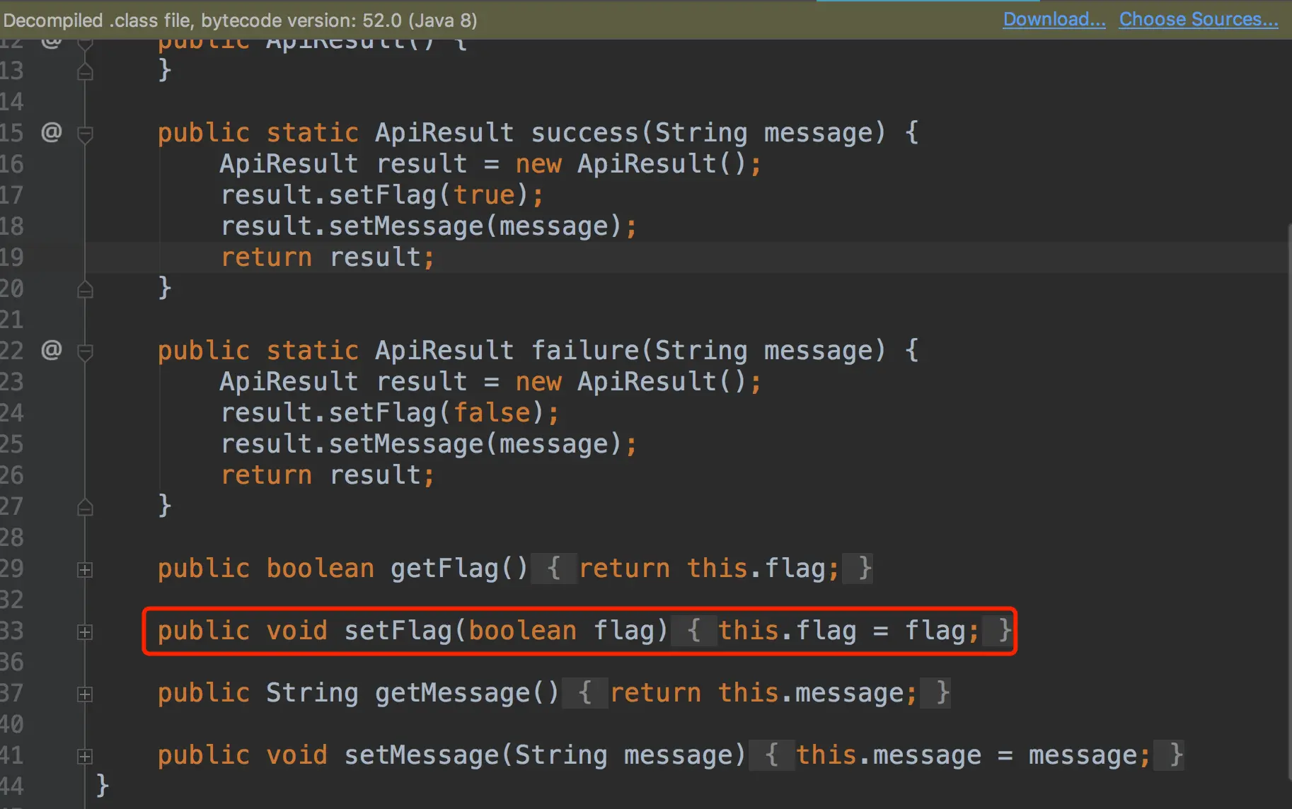 我们马上登录到小伙伴的IDE,通过导航,进入反编译后的ApiResult.class,方法入参竟然是基本类型setFlag(boolean)!!! 这就纳闷了。为何制作的新jar中,ApiResult.setFlag()需要将true装箱成Boolean对象?