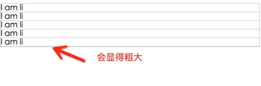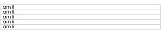 01 02 03 04 05 06 07 08 09 10 11 12 13 14 15 16 17 | <style>ul.table{ border:1px #ccc solid; margin-top:100px;}ul.table li{ border-bottom: 1px #ccc solid; list-style: none;}</style><ul class="table"> <li>I am li</li> <li>I am li</li> <li>I am li</li> <li>I am li</li> <li>I am li</li></ul> |