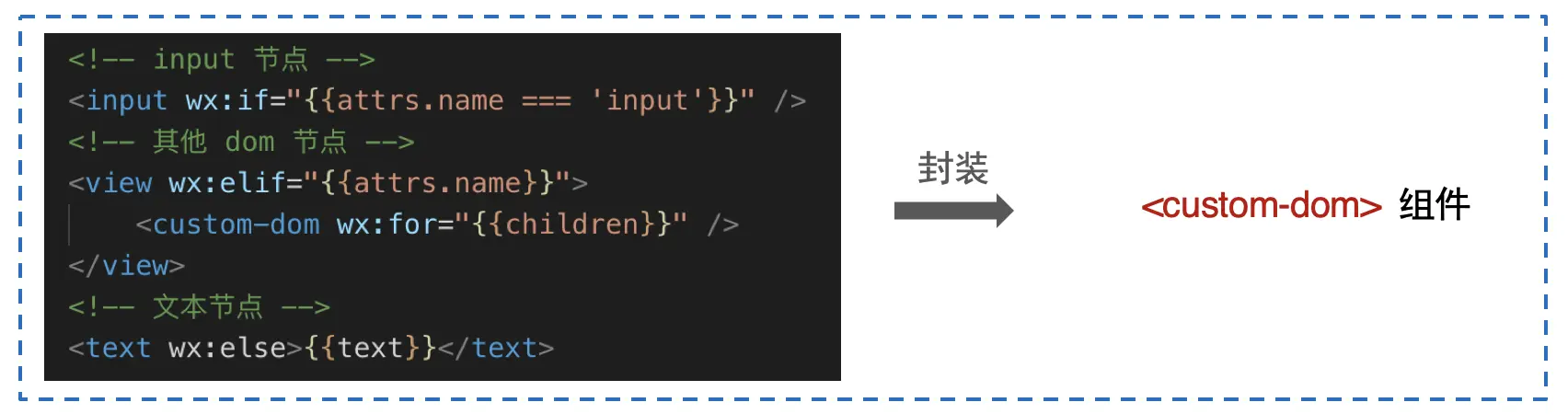 小程序组件树是根据 WXML 模板创建出来的,而仿造 Dom 树结构是不稳定的,我们无法提前预知它会生成什么样的结构,也就无法提前准备后可以描述任意 Dom 树的 WXML 模板,除非直接将 Vue 模板转换成 WXML 模板,但这样又绕回前面的问题上了。