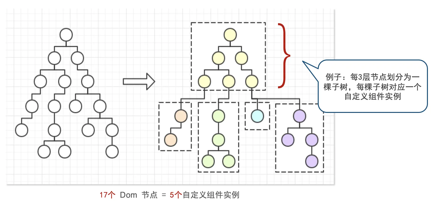 另一个思路是调整映射关系,让一个自定义组件绑定多个 Dom 节点。我们可以对 Dom 树按照一定规则进行裁剪,拆分成多棵子树,然后每个自定义组件管理一棵子树,这样的话也可以减少大部分自定义组件的创建。