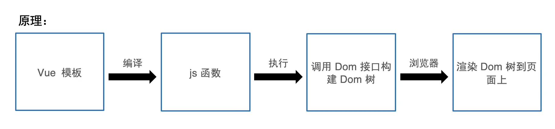 Vue 模板可以认为是一种附加了一些特殊语法的 HTML 片段,一般来说一份 Vue 模板对应一个组件,在构建阶段编译成调用 Dom 接口的 JS 函数,调用此 JS 函数就会创建出组件对应的 Dom 树片段进而渲染到浏览器上。