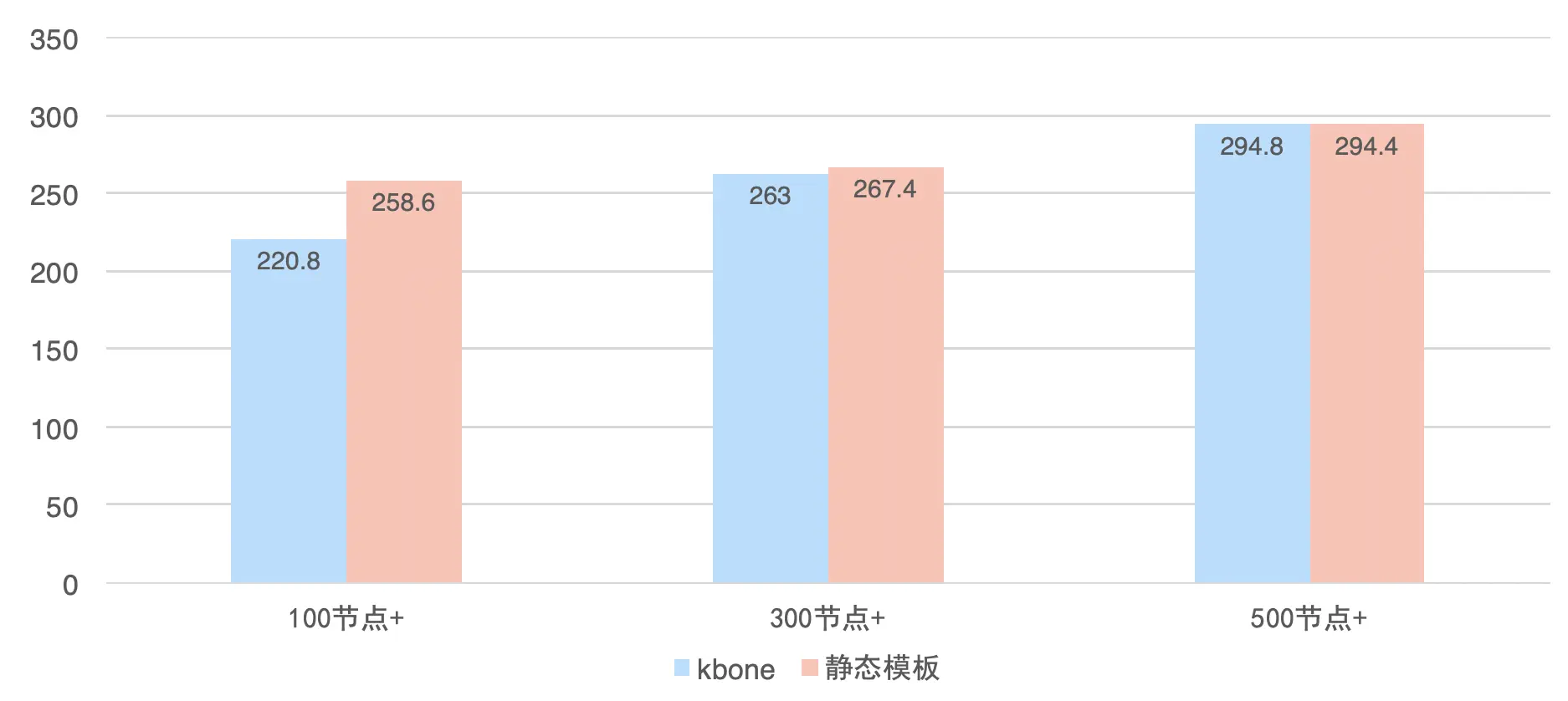 可以看到在 500 节点内的两个方案本身性能差不多,不过因为自定义组件实例创建的开销,在千节点往上的情况下会落后于静态模板方案,因为 Kbone 本身是通过牺牲性能来换取更全面的 Web 端兼容,而通常一个小程序页面的节点数在 100-500 这个区间浮动,因此这个表现是符合预期的。