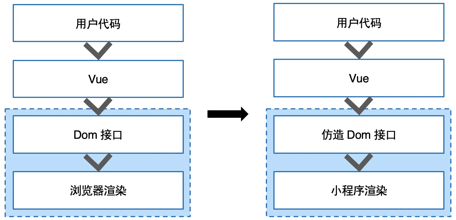 答案是有的,这里我们就得换一种思路来解决这个问题。回到最初的点上,我们无法将 Web 端代码移植到小程序中是因为小程序没有 Dom 接口,那么我们想办法做出一个适配层,将这个差异给抹掉不就行了么?