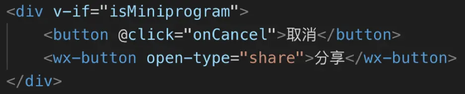除此之外,还希望使用小程序的一些特性,比如小程序端支持使用小程序的分享,那么除了上述的环境变量外,还需要用到小程序的 button 内置组件来实现分享按钮。在 Kbone 上可以使用一个特殊的标签 wx-button 来表示 button 内置组件,在调 Kbone 的仿造 Dom 接口时会将其 wx- 前缀的标签识别成内置组件,进而进行特殊处理。