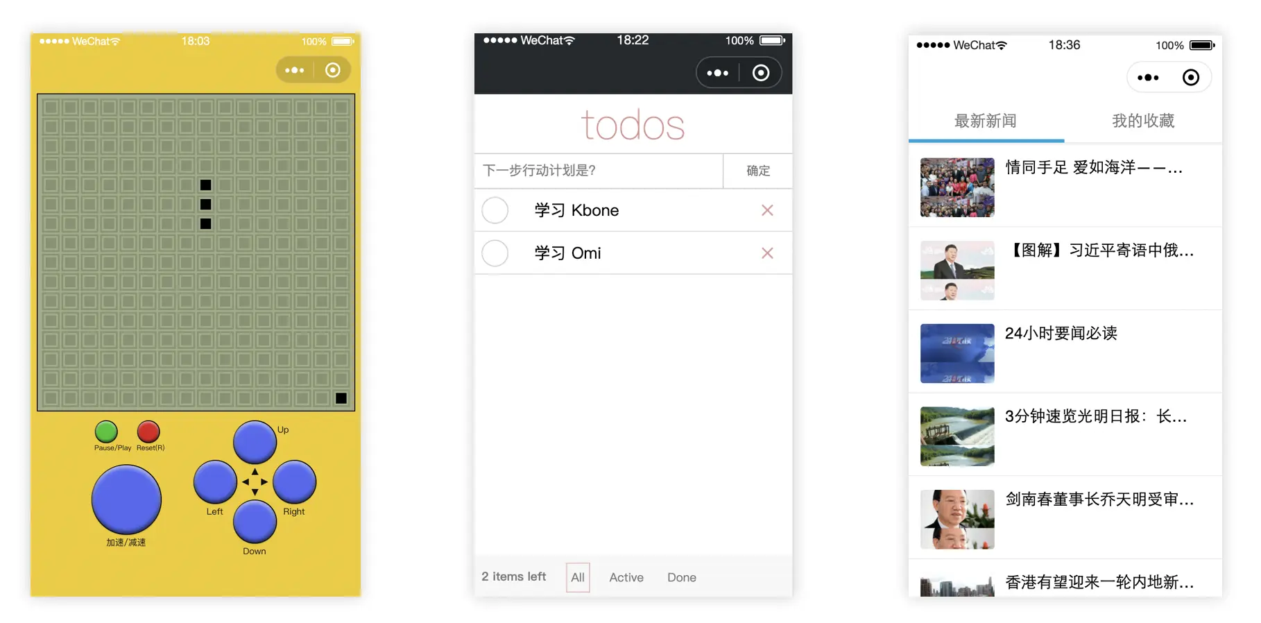 考虑到这个方案本身是通过最底层的适配方式来完成同构,那么除了 Vue 外,它其实也可以很轻松地移植到其他的 Web 框架上,比如 React、Preact、Omi 等,下面是一些基于这些框架的简单 demo: