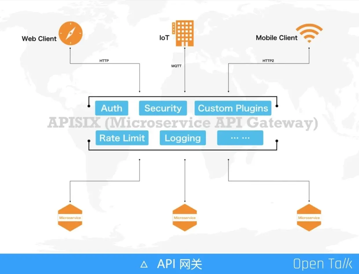 API 网关的地位越来越重要,它是所有流量的出入口,从图中可以看到请求方可能来自于浏览器、loT 设备以及移动设备等,API 网关作为中间管控层需要做安全控制、流量以及日志记录等。越来越多的企业采用了微服务的方式,以此完成内部解耦、灵活部署、弹性伸缩等技术特性从而满足业务需求。微服务的数量和复杂度也都随之水涨船高,通过 API 网关来完成统一的流量管理调度就非常必要,并对 API 网关提出了更高要求。