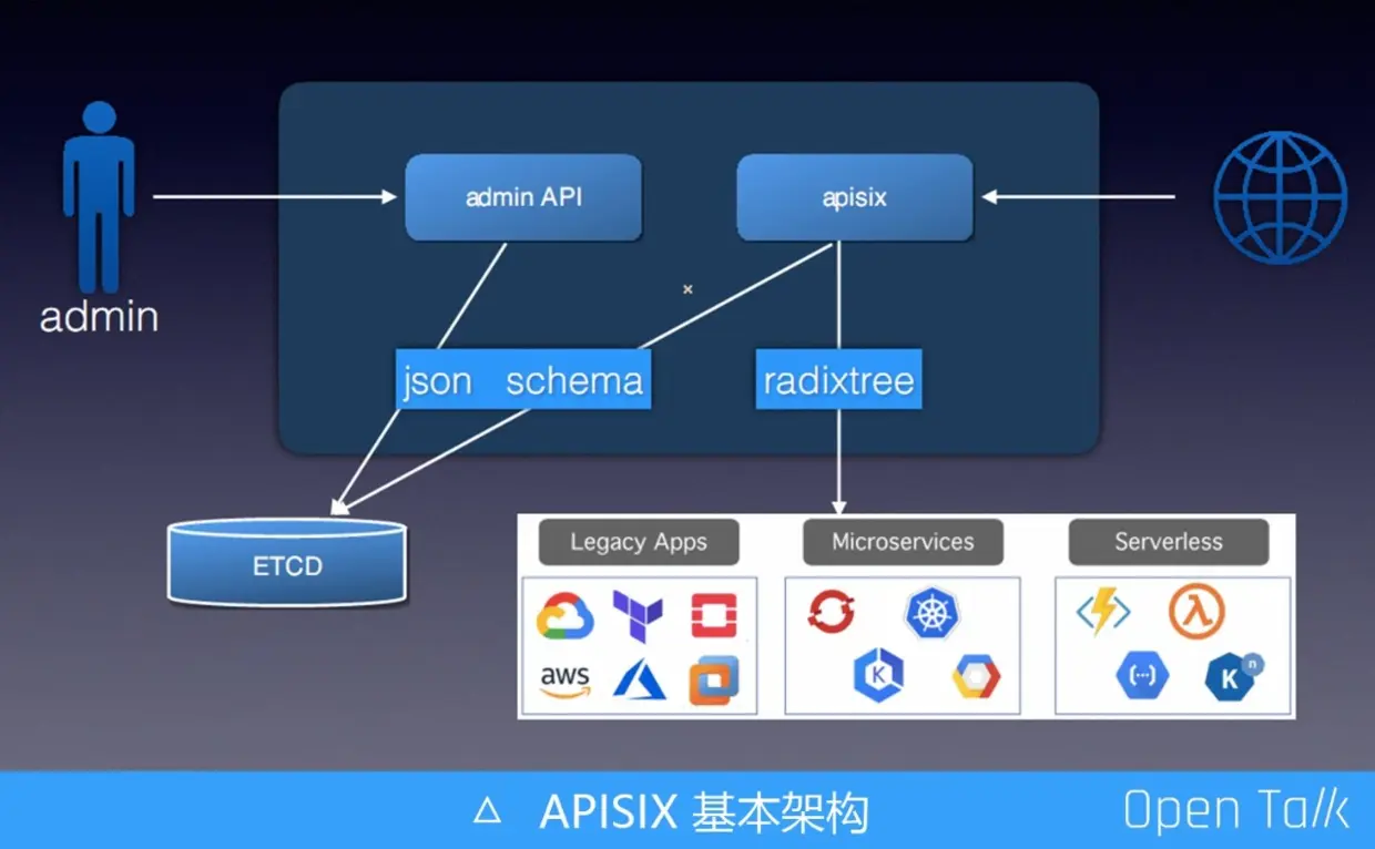 上图是 APISIX 的基本构架,由于要支持集群和高可用,所以在任何一个节点都需要包含 adminAPI 或 APISIX 内核,使用时可以只启用其中一部分或都启用。admin API 主要用于接收管理员的提交信息,通过 json schema 完成参数的校验,防止非法参数落到存储的配置中心。APISIX 内部部分处理外部请求,根据请求特征,匹配到具体路由规则,执行插件,然后把流量转发到指定上游服务。