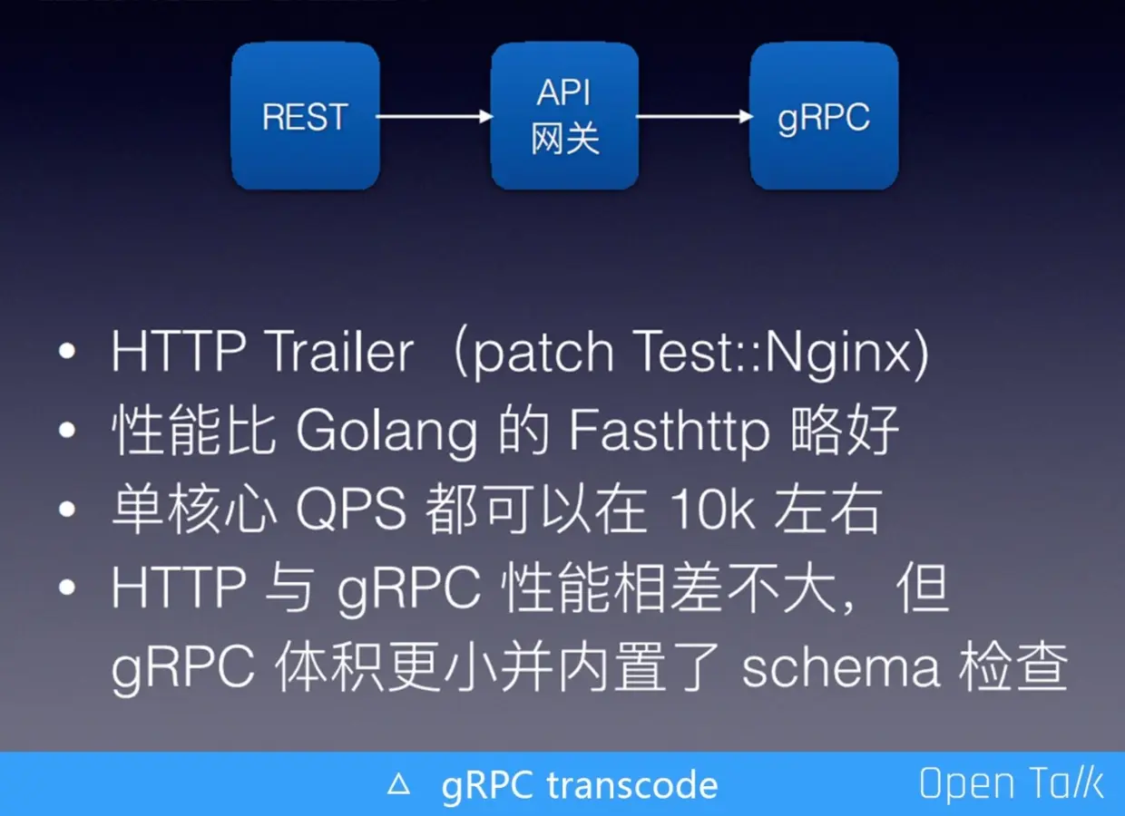 我们之前粗浅地认为 HTTP 的性能一定没有 gRPC 的性能好,现在看有点武断。gRPC 的很多优势是 HTTP 不具备的,比如它的体积更小且内置 schema 检查等。但如果你的请求体比较小,在 HTTP 上使用 json 加 json schema,它们俩的性能几乎相同,尤其是在内网环境下相差还是非常小的。如果请求体比较大编码复杂,那么 gRPC 会有明显优势。