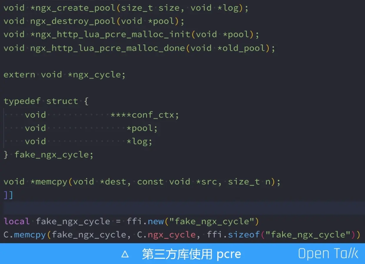 怎么解决这个问题呢?如果现在 OpenResty 有相关的 API,那么直接去申请内存池是最好的,但是可惜 OpenResty 并不具备。看看 Ningx 源码,可以看到创建 Nginx 的内存池函数定义是 ngxcreatepool(size_tsize, void *log) ,只要能获取到全局日志句柄即可。