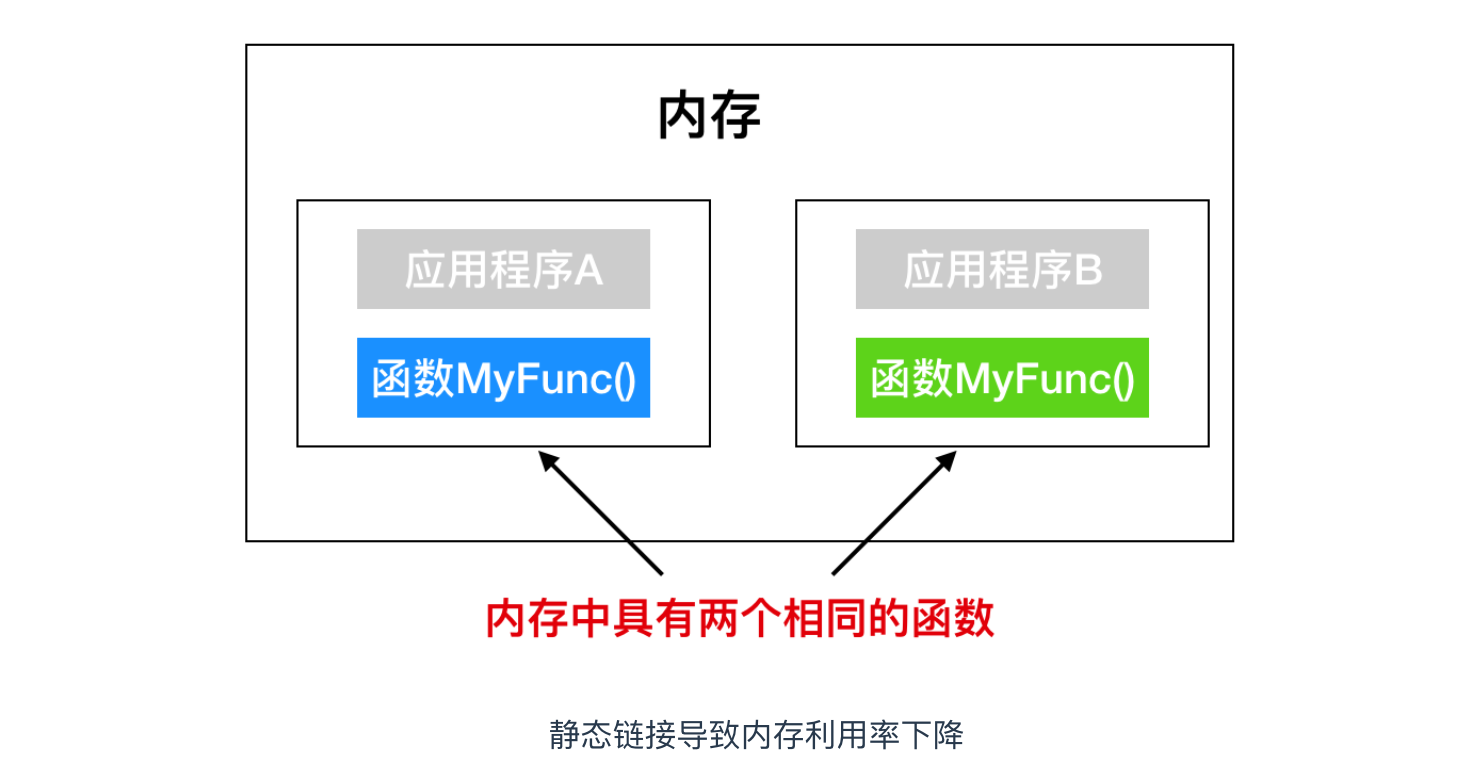 例如,假设我们编写了一个具有某些处理功能的函数 MyFunc()。应用 A 和 应用 B 都需要用到这个函数,然后在各自的应用程序中内置 MyFunc()(这个称为Static Link,静态链接)后同时运行两个应用,内存中就存在了同一个函数的两个程序,这会造成资源浪费。