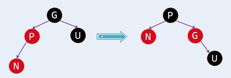 ③新插入节点N的父节点P是红色,叔叔节点U是黑色或者缺少,且新节点N是P的左孩子。方法是:右旋祖父节点G,然后将P设置为黑色,G设置为红色,达到平衡。此时父节点P是黑色,所有不用担心P的父节点是红色。