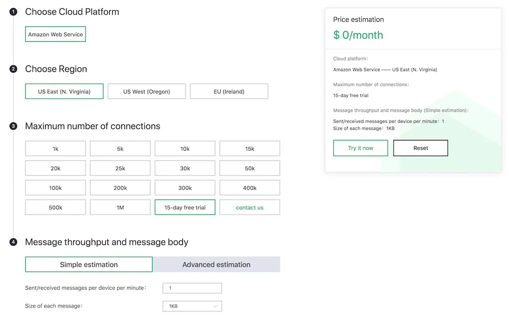 为了解决上述的问题,我们推出了基于 EMQ X 的 MQTT Cloud 服务。该服务凝结了 EMQ 团队服务客户的经验,用户只需通过在页面中输入连接数、消息发送吞吐量等基本信息后,即可一键创建出成熟、可靠的 企业级 MQTT 云服务,整个过程耗时为分钟级。该服务包含了,