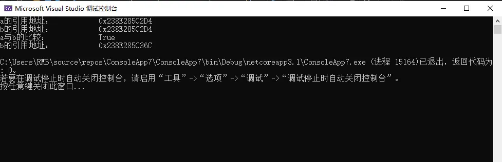 Console.WriteLine("a与b的比较:\t\t" + Object.ReferenceEquals(a, b));