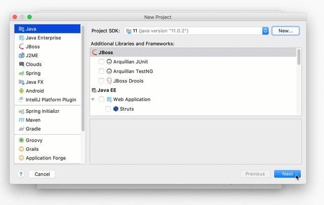 - 如果列表为空,请单击“ 新建”并指定Java主目录的路径(例如jdk-11.0.0.jdk)。