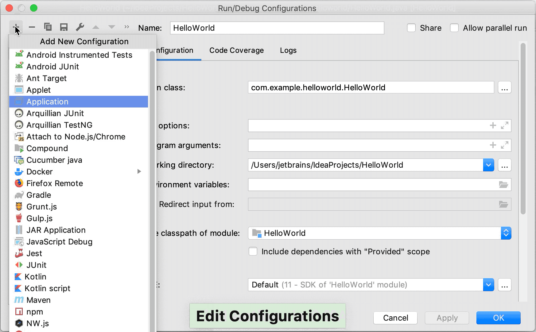 命名新配置:HelloWorldJar。