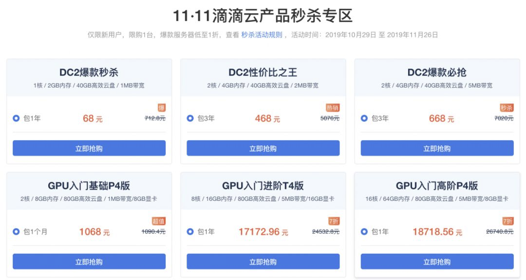 最近滴滴云官网悄悄上线了11·11特惠活动,用极尽克制的淡蓝主色,炸出了“ 年度低价”“ 高性价比 ”等巨核优惠,随便举几个例子感受下: