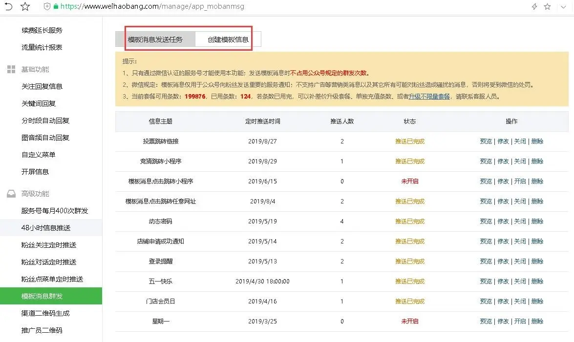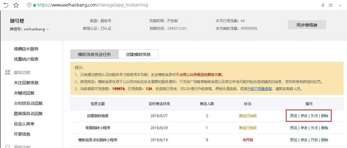 微号帮平台模板消息支持预览、修改、删除,定时发送开启或关闭。
