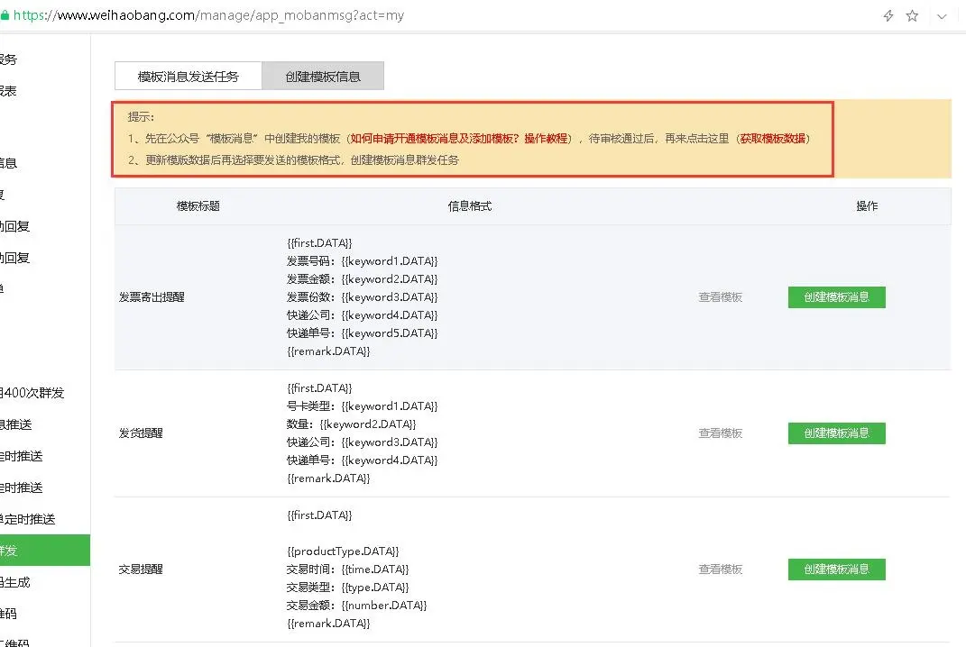 模板在公众号后台模板库中添加,微号帮平台自动同步模板,点击创建模板消息即可实现。
