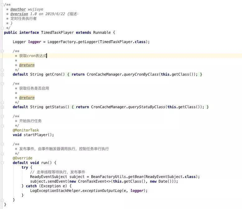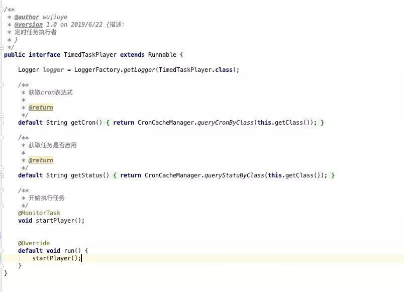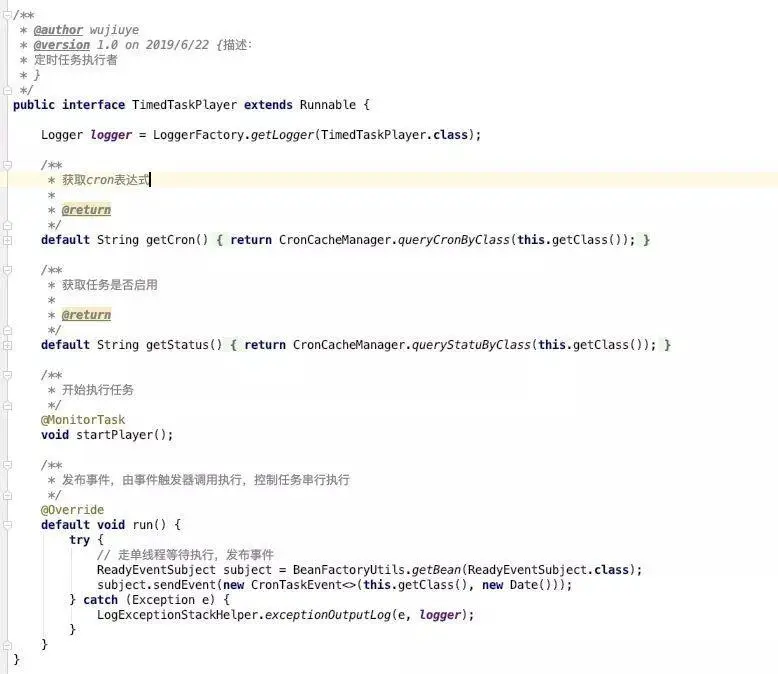 修改后的TimedTaskPlayer接口如下图,注意看run方法,神不知鬼不觉的就能将任务的执行权转交出去。定时任务就只是一个任务的执行时间节点的掌控者,不再是任务执行的掌控者,简简单单的就被抽空了身体。