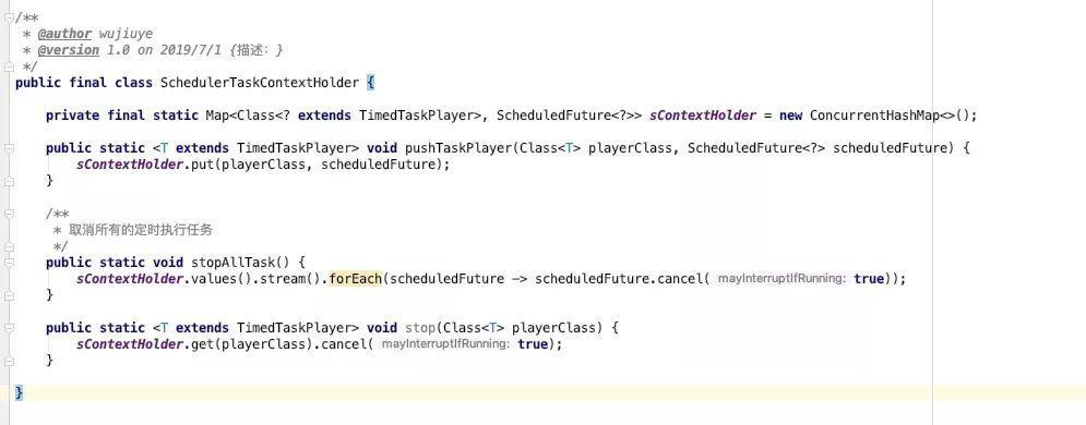 提供一个所有任务的ScheduleFuture的持有者,提供停止所有任务的方法,用于更新配置后取消所有定时任务,由引导器重新启动。即更新配置后重启所有定时任务。