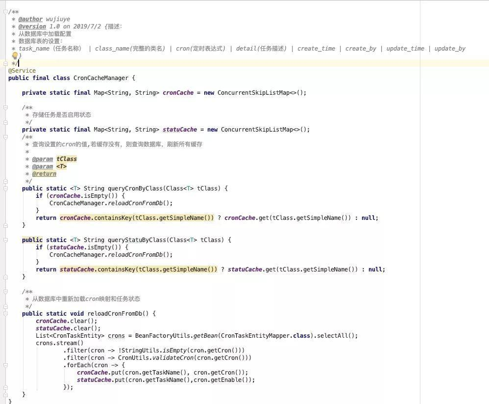 任务的Cron表达式配置管理类,提供reloadCronFromDB方法给接口调用更新任务的cron表达式缓存。这里的注释有改动,存的不是完整类名,而且去掉包名后的类名,同时Bean的name(spring管理)也是去掉包名后的类名,首字母大写。