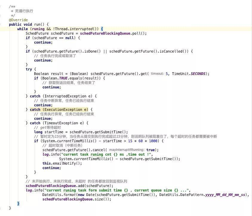 所以,我想我的定时任务系统也能有这样的功能。加入监视器,在任务提交到单线程线程池时,也将返回的Future提交到监视队列,由监视器线程轮询队列中任务的执行情况,发现超时未执行完的任务直接中断执行,否则将任务放入监视队列末尾。这里的超时目前我只能拿任务的提交时间和当前时间计算。