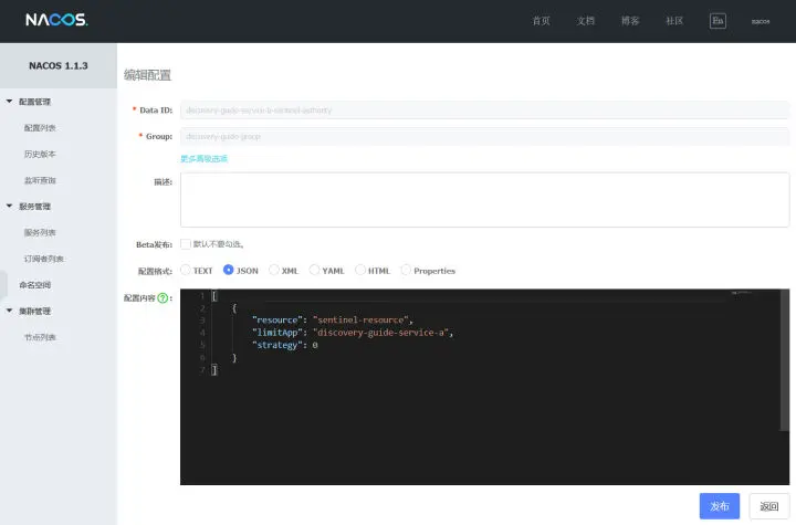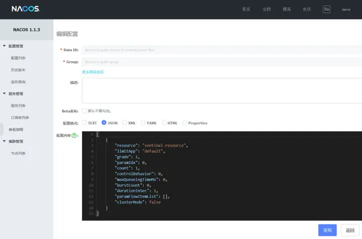 1. Nacos的Key格式:Group为元数据中配置的[组名],Data Id为[服务名]-[规则类型]