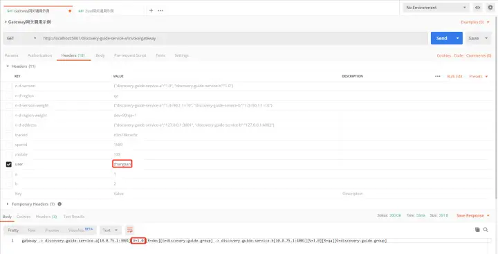 - 当传递的Http Header中user=zhangsan,当全链路调用中,API网关负载均衡discovery-guide-service-a服务到1.0版本后再去调用discovery-guide-service-b服务,最终调用成功